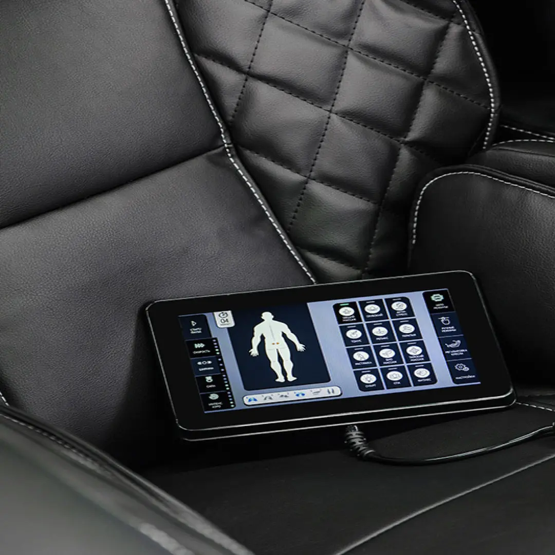 Одним из основных преимуществ модели является удобное и русифицированное управление креслом, благодаря чему можно выбирать различные режимы, места воздействия, включать инфракрасное излучение и многое другое.