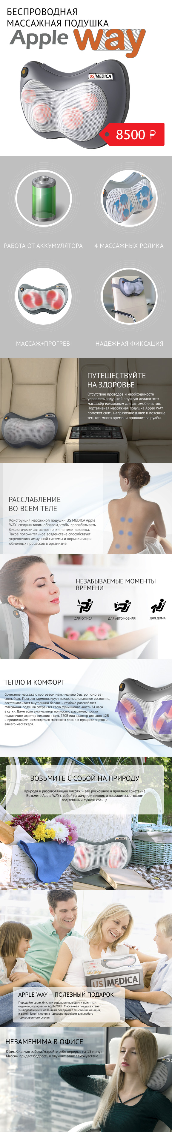 Отзыв: Отличная удобная подушка. Приобрели ее в Аэропорту , работает на аккумуляторе , с ней хоть куда, и может заряжаться от прикуривателя в автомобиле. Пользуемся и мы и родители , мама берет ее на дачу с собой. Муж берет в дорогу в автомобиль. А я делаю массаж дома. И шею и поясницу и колено и стопы. Классная подушка.